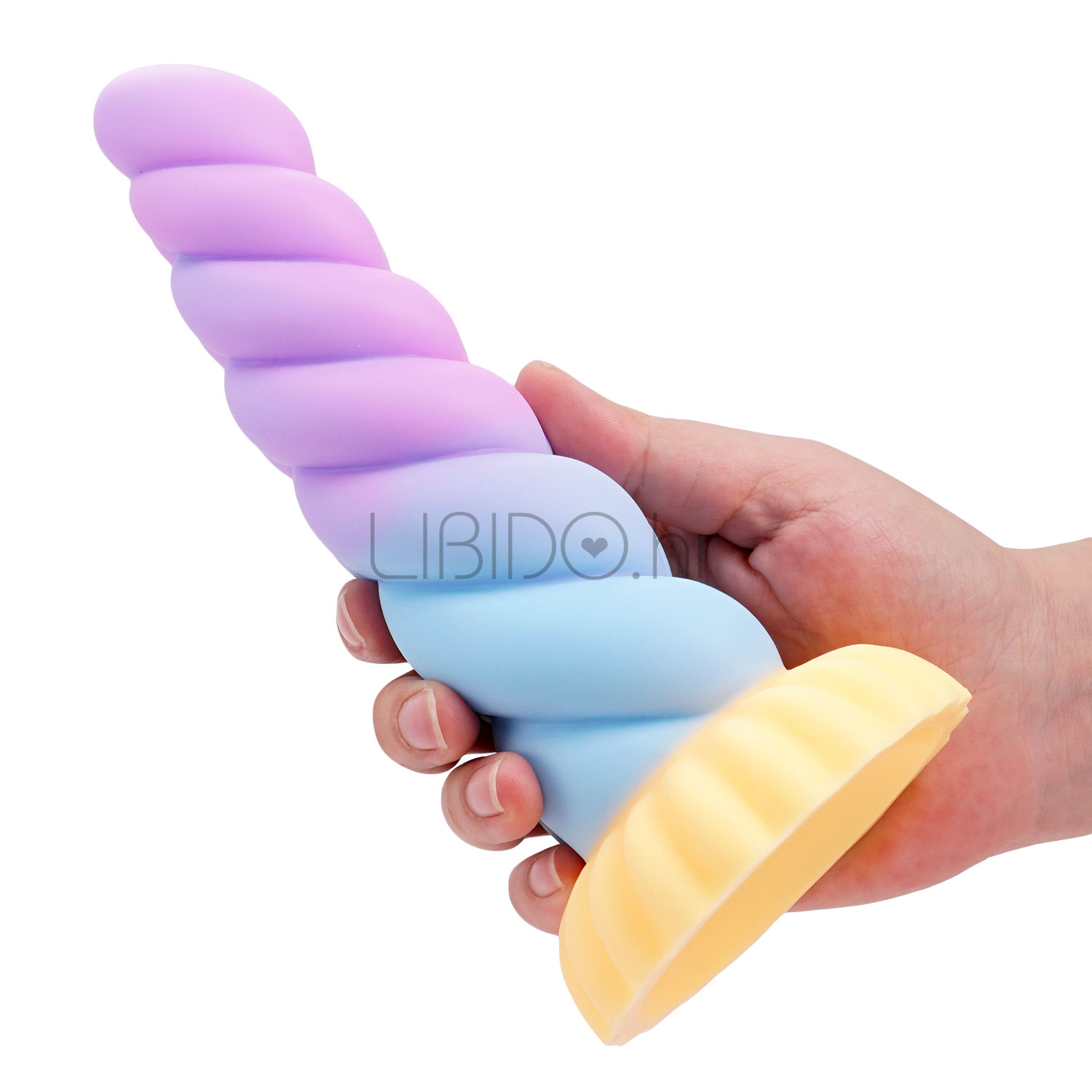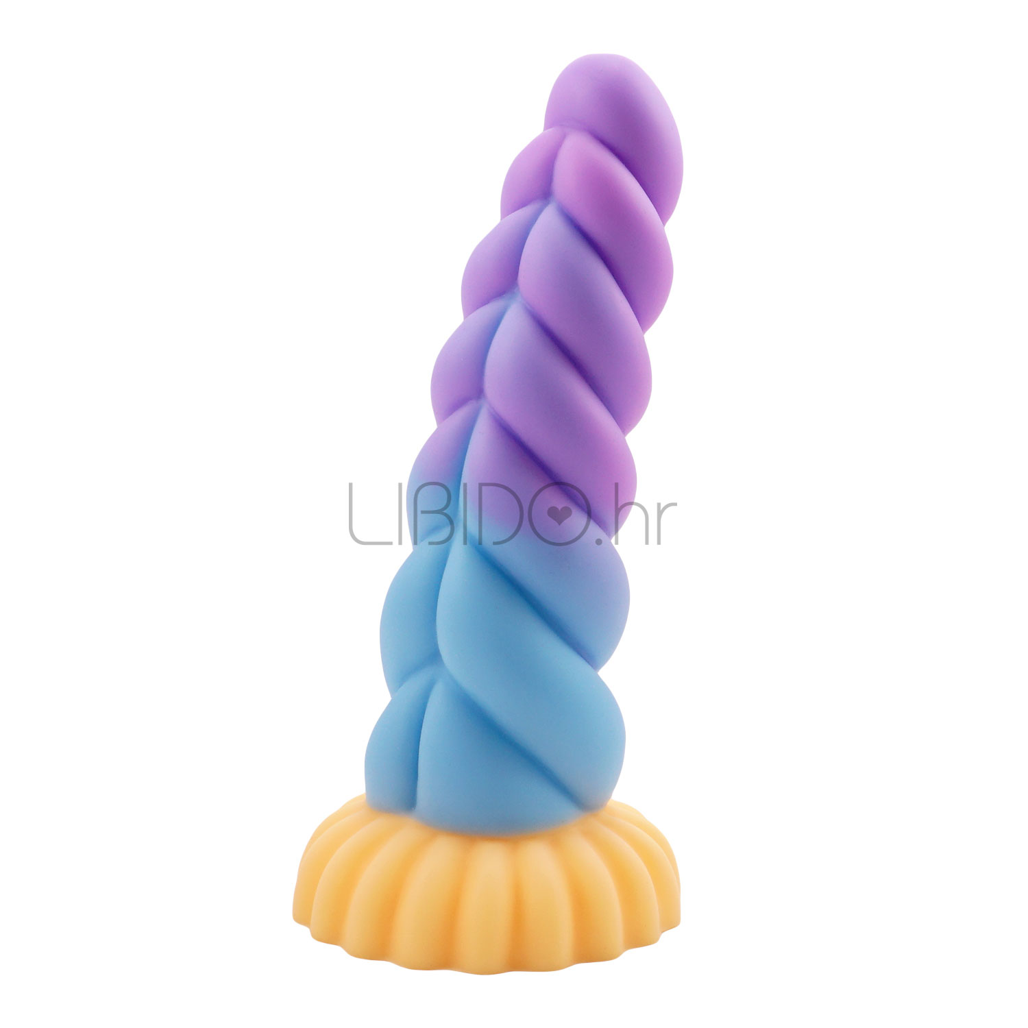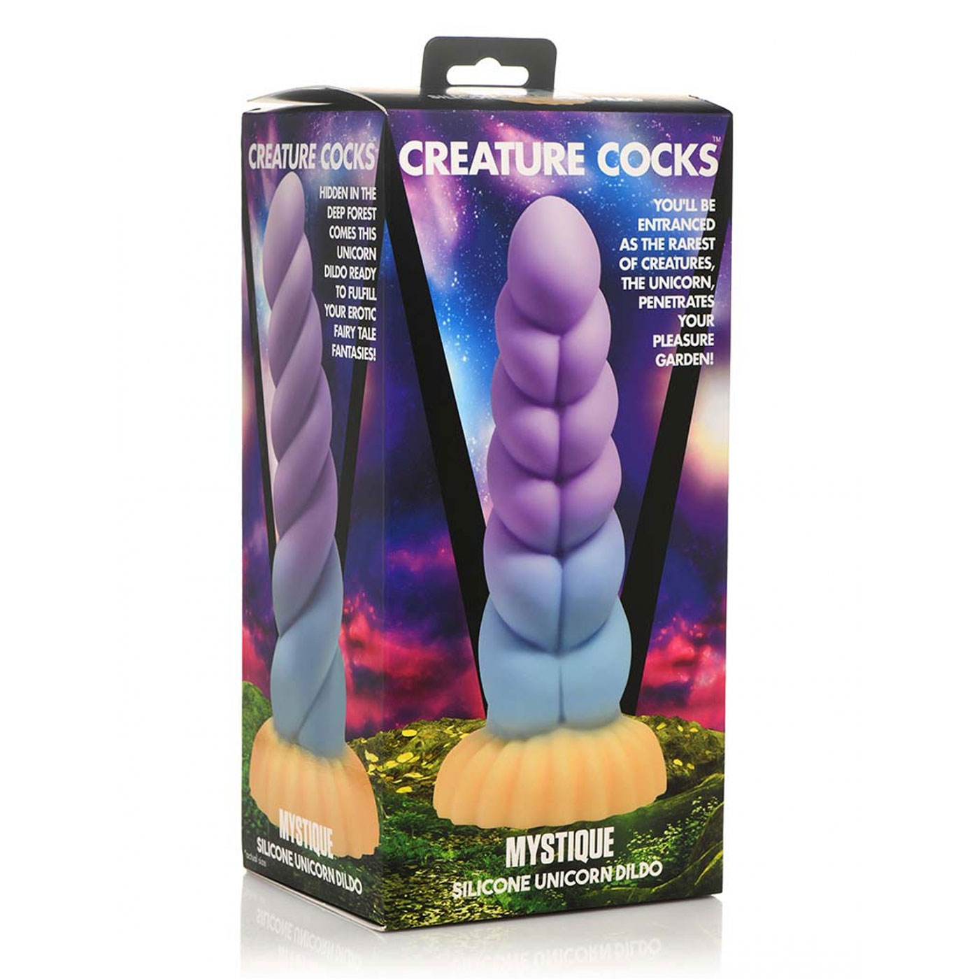 Mystique je vrhunski fantasy dildo oblikovan kako biste uživali u maksimalno bogatoj teksturi koja će svakim centimetrom drugačiji podražaj. Nabori su senzualno glatki, no svaki se značajno povećava za izuzetan osjećaj širenja u neodoljivoj kombinaciji boja. Ljubičasti vrh se vrlo postepeno pretvara u plavu boju pri dnu a baza je efektno narančasta.